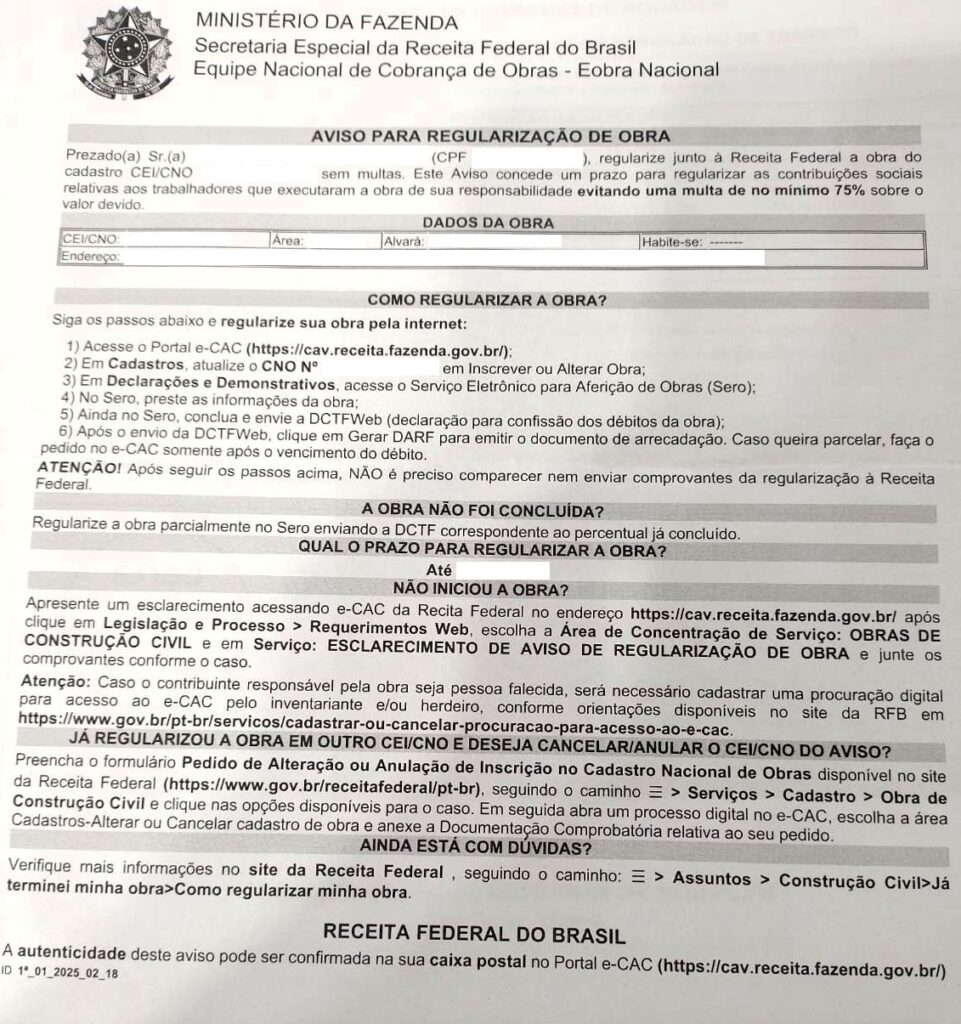 Realizar o Cadastro Nacional de Obras-CNO junto à RFB